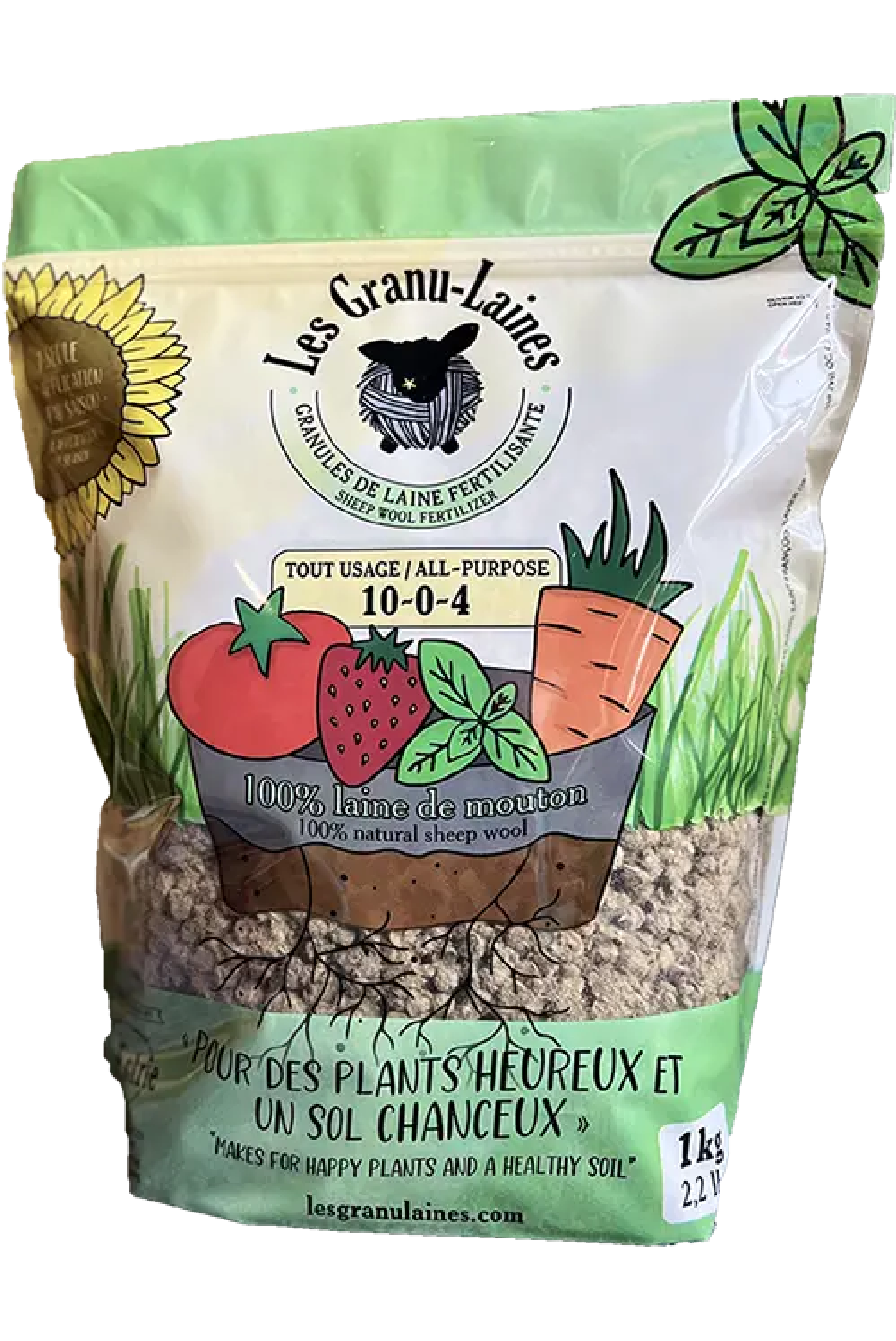 Fertilisant organique constitué à 100% de laine québécoise. Efficace pour vos différentes cultures, importante source d’azote, possédant plusieurs caractéristiques pour la santé et la productivité de vos plantes. Excellents résultats en une seule application.